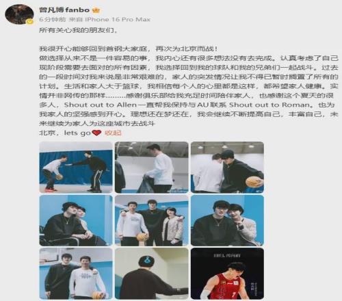 北京队正式完成与曾凡博的续约,仅需篮网向FIBA官方出示澄清信即可注册出战CBA新赛季。