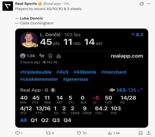 东契奇这场比赛后也顺利登上了全美体育热搜榜单,他的个人表现是这一天NBA中最劲爆的,早些时候他刚刚入选了NBA杯赛最佳阵容。