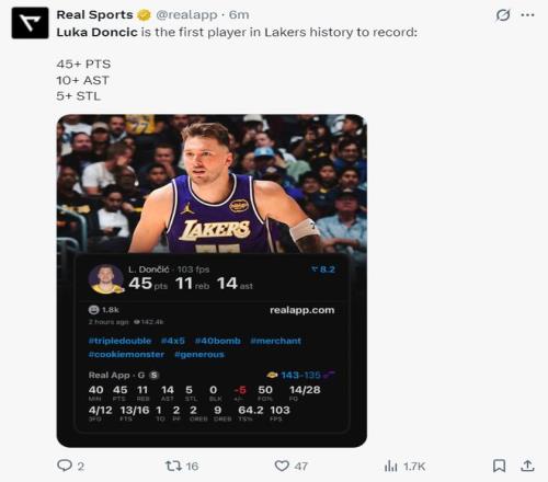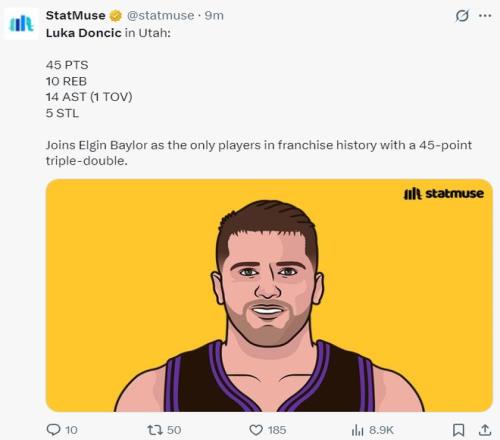 1.东契奇拿到45+三双成为湖人队史第二位,另一位是埃尔金-贝勒;