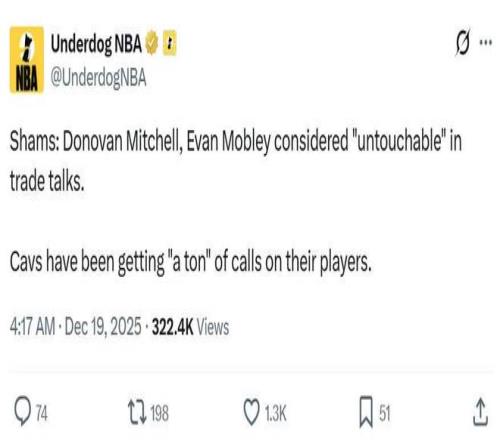 根据名记Shams报道,已经有数支球队致电骑士队询问交易可能,骑士队明确表示米切尔与莫布利是球队唯二不可交易球员,也就是说除了两人之外,其余球员都可以交易。