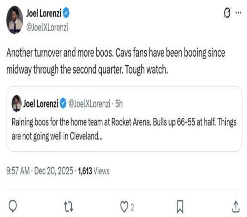 面对骑士队糟糕的表现,根据美记Joel Lorenzi报道,骑士队主场球迷倒戈,从第二节开始便嘘声四起。